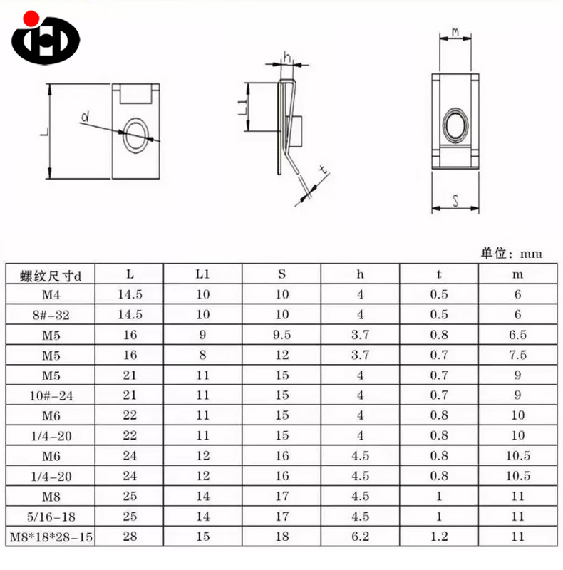 炭素鋼Uクリップナットは、ナットとスナップスプリングの機能を組み合わせた革新的なファスナーです。通常、金属材料で作られており、内部スレッドとスナップスプリング構造を備えたナッツ部分があります。このユニークなデザインにより、スナップスプリングナットは、取り付け後にボルトをしっかりと固定し、追加のロック力を提供し、ナットが緩めないように効果的に防止し、接続の安定性を確保できます。