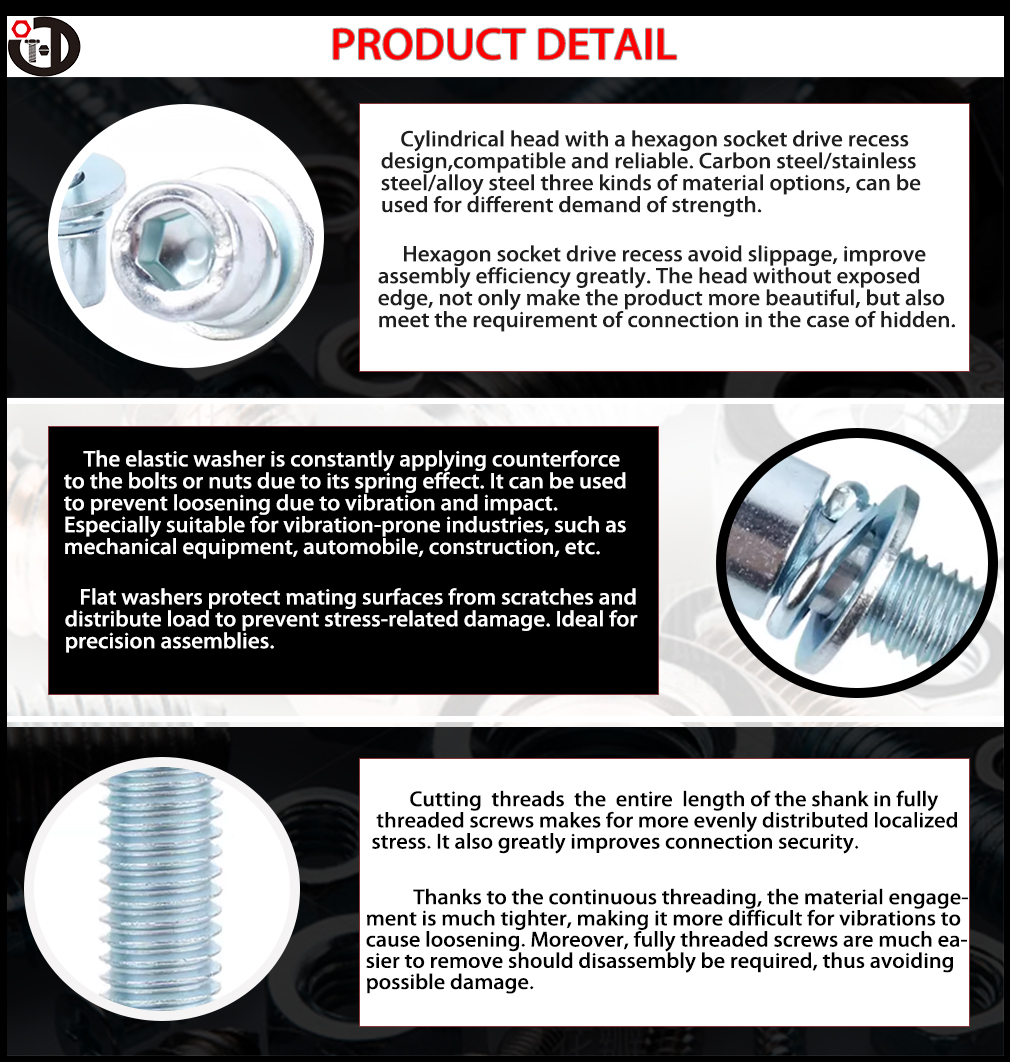 シリンダーヘッドソケットTri-Gripネジは、高精度のヘックスソケットドライブと円筒形のヘッドデザインのおかげで、高トルク伝送と低プロファイルの設置に優れています。統合されたトライコンポーネント構造(ネジ +フラットワッシャー +スプリングワッシャー)は、アセンブリを簡素化しながら、振動抵抗を緩めて強化することを防ぎ、動的負荷アプリケーションに最適です。機械製造、自動車産業、電子機器、精密機器で広く使用されており、高周波の分解または重要な接続のための信頼できるソリューションを提供します。