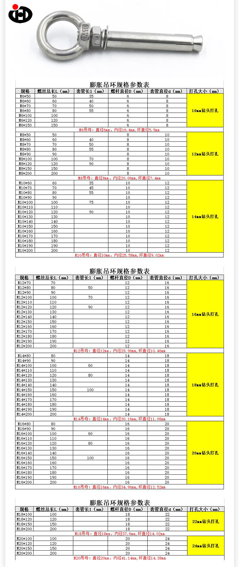ヘビーデューティーアイボルトアンカーは、張力が400mpaを超える張力304ステンレス鋼材料で作られており、数百キログラムから数トンまでの範囲の引張力に耐えることができます。ソファ、洗濯機、重い照明器具の取り付け、産業用具や保護手すりの設置など、信頼できる固定サポートを提供できます。